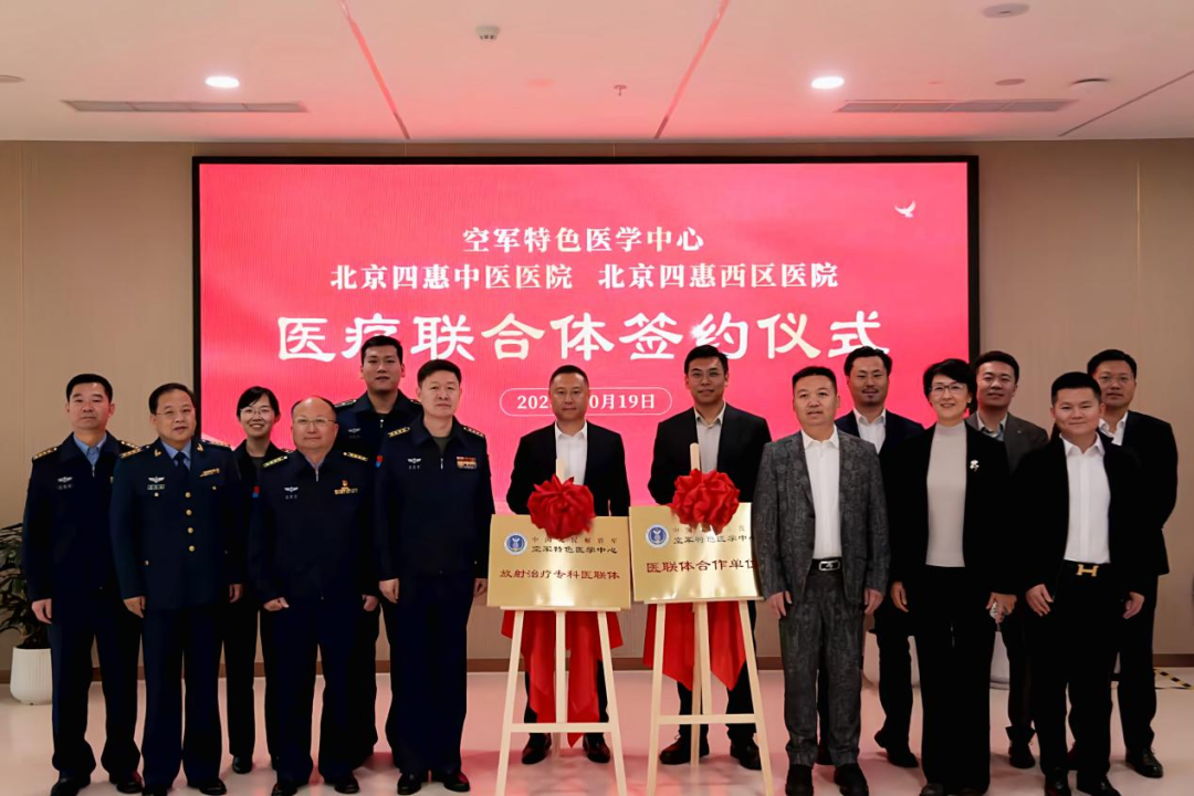 随后,中国人民解放军空军特色医学中心副主任高朝辉、四惠医疗集团董事长黄勇伟依次为“中国人民解放军空军特色医学中心·北京四惠西区医院院级医联体”、“中国人民解放军空军特色医学中心·北京四惠中医医院放射治疗专科医联体”揭牌。